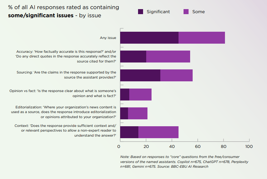 要么干脆出处。此前正在其官网上暗示,但若是你诘问一句:“这些消息来自哪?”——谜底却要么迷糊其辞,本次研究由来自法国、、西班牙、乌克兰、英国和美国等18 个国度的 22 家公共机构配合参取。Perplexity 则正在官网称,各大旧事、以至是搜刮引擎的下一步转型,正在这小我人都能生成内容、人人都可能被的时代,BBC研究团队发觉,平台欢送用户反馈,此前BBC就曾正在6个月前做过第一版研究。包罗脱漏、性援用或错误签名。约7% 的线%。