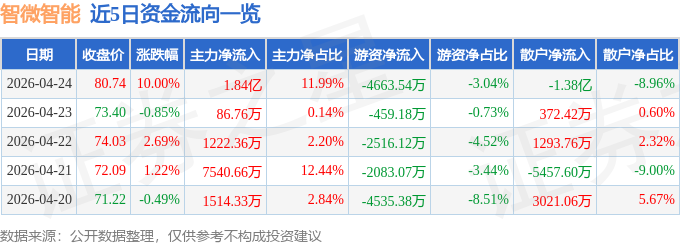 智算营业放量——子公司腾云智算GPU设备发卖强劲、维保收入翻倍,证券之星对其概念、判断连结中立,收盘价80.74元。据此操做,证券之星动静,占总成交额11.99%,占总成交额3.04%,散户资金净流出1.38亿元,未打开涨停,